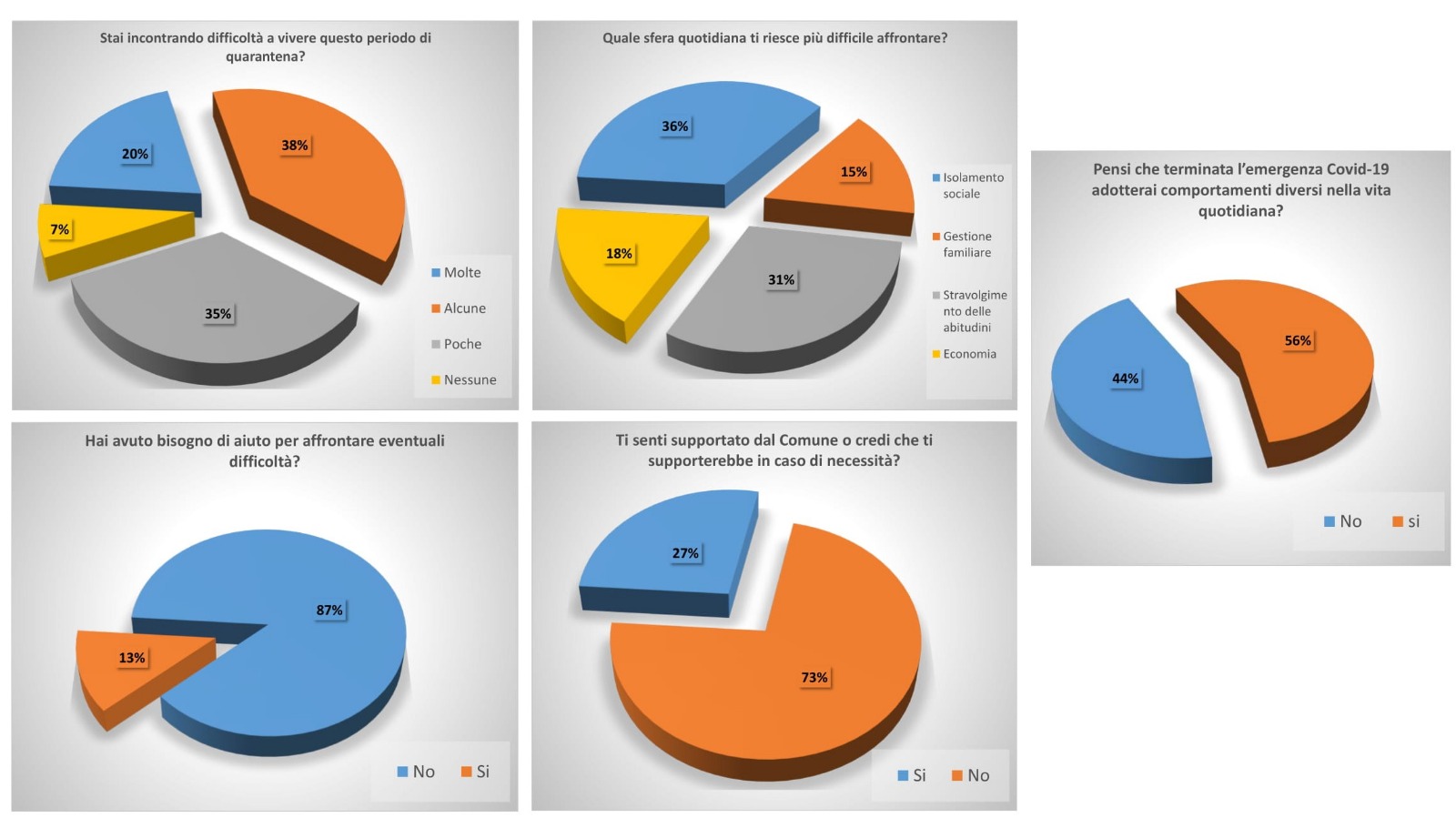 C’è stata una risposta netta sul fatto che la quarantena ha portato con sé molte (20%) e alcune (38%) difficoltà di tipo economico, ma non solo: l’isolamento sociale e lo stravolgimento delle abitudini quotidiane sono state difficoltà altrettanto importanti per coloro che hanno voluto rispondere alle nostre domande così come la gestione del quotidiano. E, se è vero che solo una piccola minoranza (13%) ha avuto bisogno di aiuto è anche vero che il 73% di chi ha risposto non si è sentito supportato dal Comune né crede che la nostra amministrazione lo supporterebbe in caso di necessità. “Questo mette in evidenza una certa distanza tra la politica, per come viene fatta a Magenta, e il vivere quotidiano dei cittadini con le loro necessità”, è il commento di Mario Garbini che ha organizzato la raccolta dei dati.
