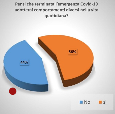 Eravamo curiosi anche di sapere se l’emergenza porterà ad una modifica dei comportamenti una volta che questo periodo di isolamento sarà terminato: ci ha stupito un po’ il dato che il 44% di chi ha risposto non pensa di adottare comportamenti diversi nella vita di tutti i giorni al termine dell’emergenza.